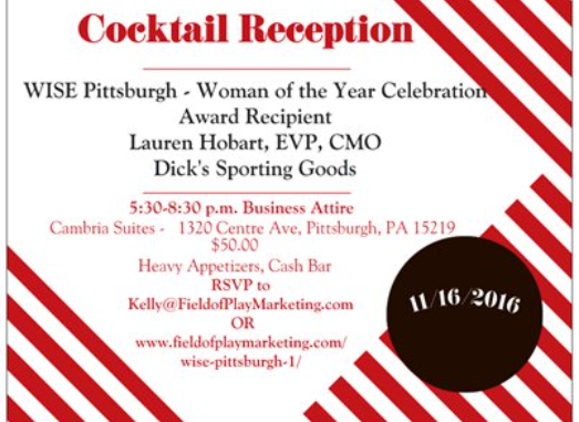 Join us as we celebrate the leadership and success that Lauren Hobart, EVP,CMO at Dick's Sporting Goods has experienced. Her contribution to the success of women in the sports industry in Pittsburgh will be celebrated at this wonderful event.
